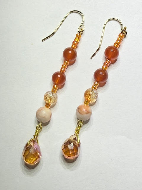 she starts sweet, finishes strong, and always leaves a glow behind. these baubles were inspired by this designer's favorite spirit. she begins with red agate, fading through orange crystals, to eventually end up at red line jasper with a twinkly amber crystal dangle.